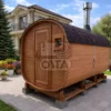 Представляем вам уникальную фотографию баня-бочка, сооруженной из благородного дерева на частной придомовой территории. Она установлена недалеко от красивого дома, что подчеркивает гармоничное сочетание архитектуры и древних традиций русской бани. Баня-бочка представляет собой компактную конструкцию, удобную для хранения и установки на небольшом участке земли. Внешний облик изделия демонстрирует высокое качество обработки древесины и соблюдение технологий возведения. Специальная обработка поверхностей защищает дерево от неблагоприятных погодных факторов и продлевает срок службы конструкции.