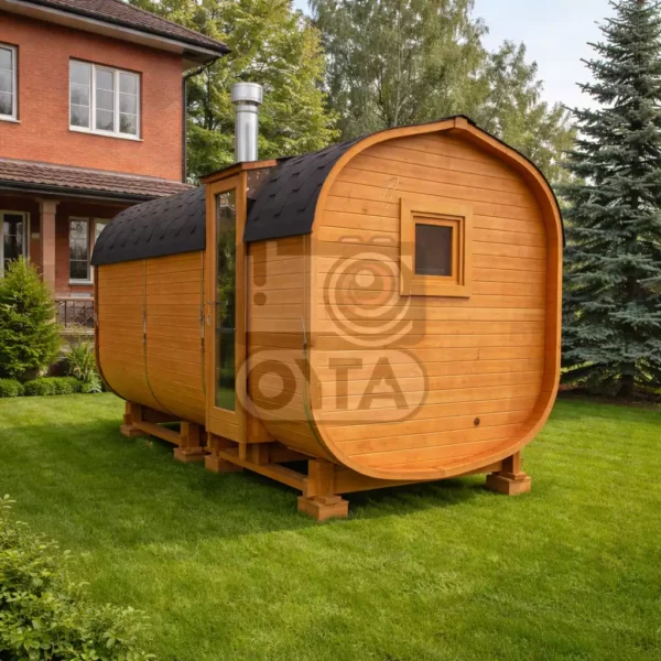 Удобство и простота сборки сделали баню-бочку популярной альтернативой традиционной бане. Возможность регулярного посещения такого сооружения позволяет восстановить жизненные силы, снять стресс и поддержать физическое здоровье. Подобная фотография идеально подойдет для продвижения бань-бочек, оборудования для сауны, строительных материалов и ландшафтного дизайна. Ее можно использовать в статье, каталоге товаров или на официальном сайте компании, специализирующейся на продаже деревянных конструкций и благоустройстве территории.
