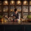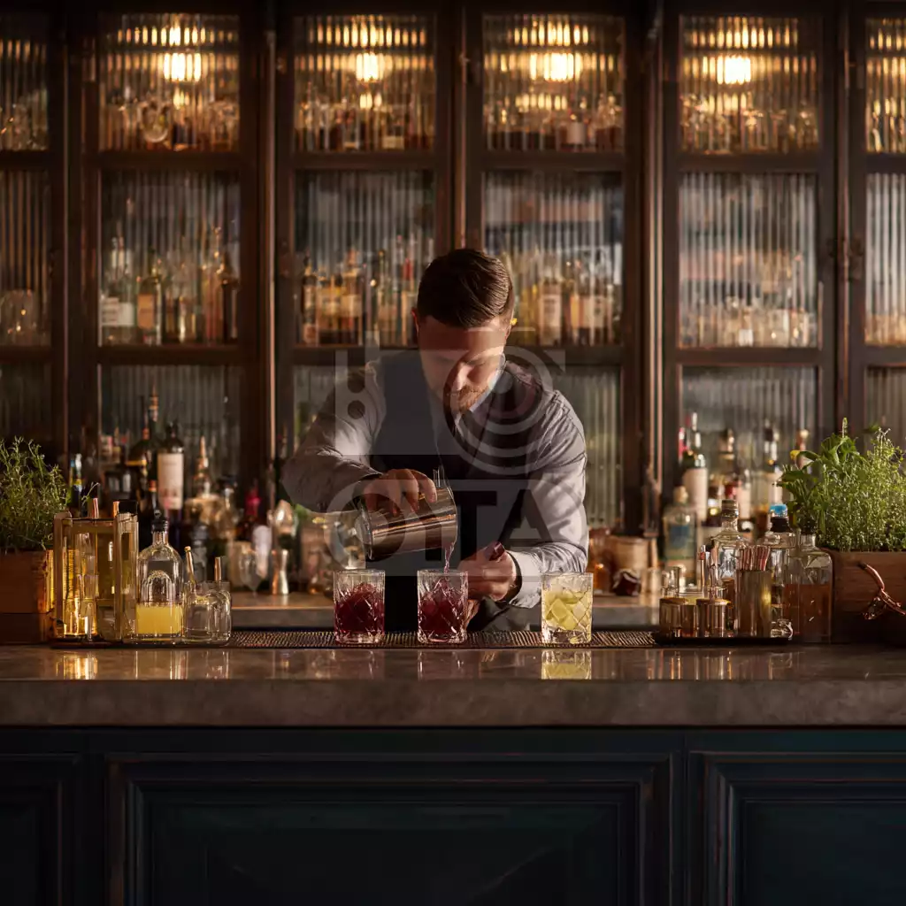 На представленной фотографии бармен запечатлен опытный специалист, работающий за стойкой. На полированном покрытии стойки равномерно расставлены бутылочки ликёра, разнообразные стеклянные ёмкости и прочие принадлежности для приготовления оригинальных коктейлей. Одевшись в фирменную одежду — рубашку и жилетку, — он излучает уверенность и мастерство. На снимке отчетливо видно, как профессионал наливает напитки в прозрачные бокалы, демонстрируя точность движений и сноровку, которую отличает многолетний опыт работы. Каждая мелочь в кадре подчёркивает исключительное качество обслуживания: сверкающие предметы посуды, порядок инструментов и продуманная сервировка.