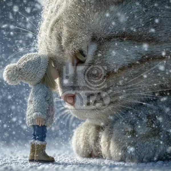 Но самое важное здесь — контакт, объединяющий сердца обоих персонажей. Эти животные знают толк в дружбе и близости, позволяя зрителям почувствовать настоящую душевную теплоту, исходящую от простого жеста. Композиция усиливается окружающей обстановкой: лёгкий зимний пейзаж, где кружатся мелкие хлопья снега, придаёт атмосфере дополнительную мягкость и романтику. Каждая снежинка становится символом тихой радости и детских мечтаний, усиливая ощущение сказочности момента.