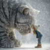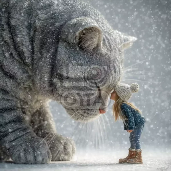 Что особенно привлекательно в этом кадре — контраст размеров: девочка совсем крошечная, а кот намного крупнее неё, однако их лица расположены практически одинаково, словно два старых приятеля обмениваются теплыми взглядами. Добавляет особое настроение зима, окутавшая сцену легкими снежинками, тихо порхающими вокруг. Создается ощущение, что герои находятся в своём собственном маленьком мире, защищённом от посторонних глаз.