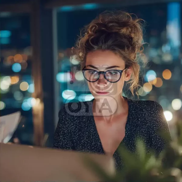 Фотография девушка в офисе, она сидит за компьютером, через панорамные окна видно что уже вечер, идеально подходит для материалов о рабочем процессе, продуктивности и деловой атмосфере современного центра. Это изображение передает динамику офиса: свет от монитора сочетается с теплом вечерних огней, создавая ощущение сосредоточенности и целеустремленности.