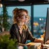 Эта фотография девушка в офисе задаёт тон продуктивности и сосредоточенности в современном рабочем пространстве. Это изображение погружает в атмосферу рабочей сосредоточенности и профессионализма. Светящийся экран компьютера контрастирует с мраком за окном, подчеркивая продуктивность и целеустремленность героини. Огромные панорамные окна становятся окном в динамичный вечерний город, создавая ощущение движения и энергичного ритма рабочего дня.