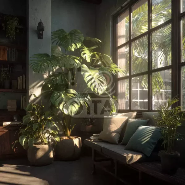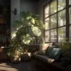 Представленная фотография наглядно иллюстрирует преимущества выращивания растений дома: зелень листьев и роскошные формы придают помещению уют и тепло. Комнатные растения являются неотъемлемой частью современного дизайна интерьера, привнося жизнь и энергию в любое помещение. В интерьере комнаты большие окна играют ключевую роль, пропуская естественный дневной свет, который подчеркивает декоративность растений и обеспечивает комфортные условия для их роста. Эффект солнечного освещения делает пространство привлекательным и расслабляющим, наполняя его особым настроением.