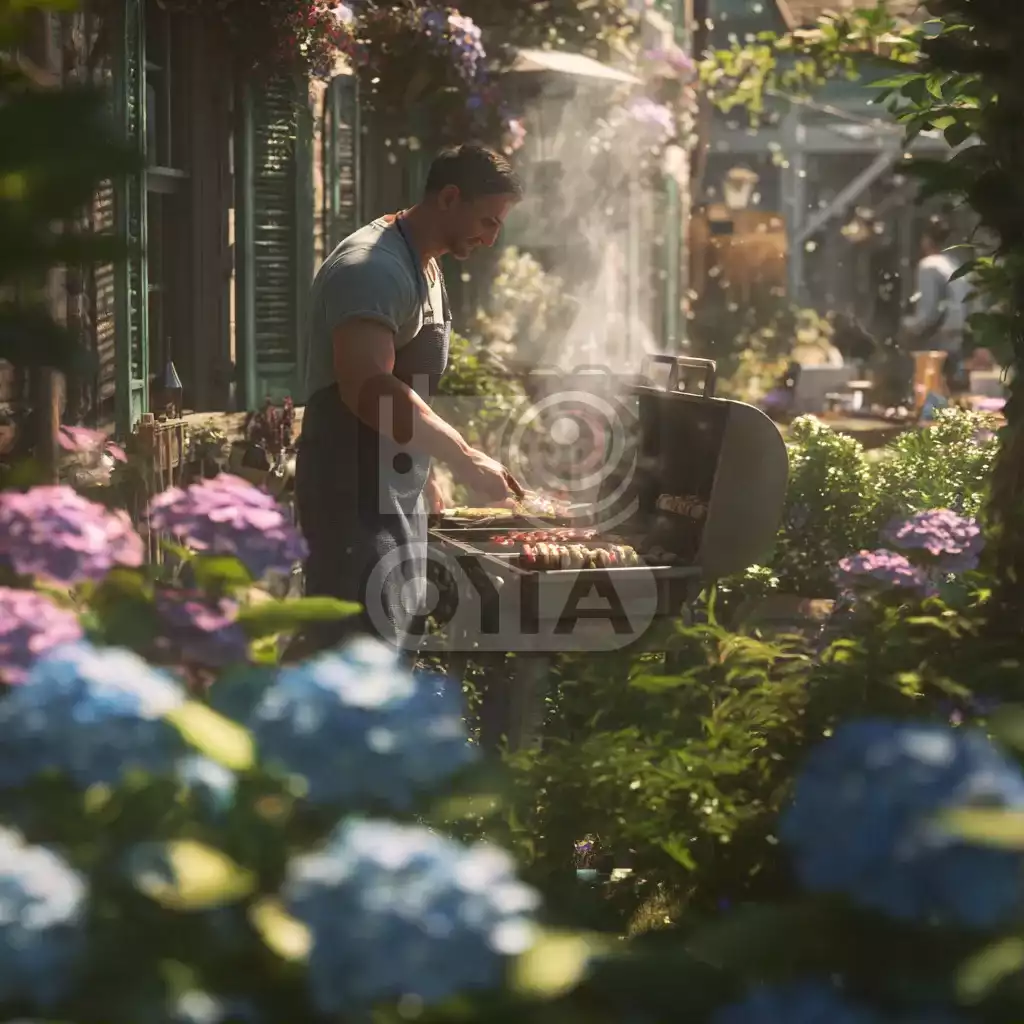 Яркая фотография мужчина и барбекю демонстрирует настоящий праздник кулинарного искусства и семейного отдыха. На ней запечатлен человек, сосредоточенно занимающийся приготовлением овощей на открытом огне барбекю. Теплое солнце ласково освещает его лицо, а позади возвышается уютный дом, символизирующий комфорт и семейное благополучие. Главным украшением снимка выступают пышные кустарники гортензий с красивыми розовыми и голубыми соцветиями, словно распускающимися специально для того, чтобы сделать событие поистине запоминающимся. Возникающее ощущение покоя и уюта моментально передается любому, кто смотрит на эту идиллическую картину.