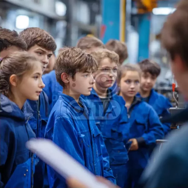 Представляем вашему вниманию уникальную фотографию как будущие профессионалы проходят обучение и адаптируются к требованиям реального сектора экономики. Парни и девушки одеты в фирменную одежду синего цвета, подчеркивающую корпоративный стиль и подчеркивающую общность коллектива. Участники группового кадра сосредоточены, внимательно прислушиваются к рекомендациям старших товарищей и стараются усвоить правила работы на предприятии.