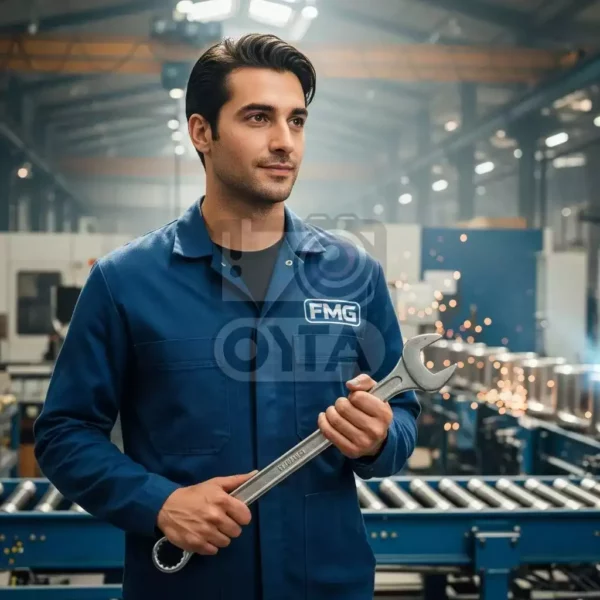 Фотография рабочего в цеху в синем рабочем костюме, который уверенно держит гаечный ключ, передает дух индустриального прогресса и техники. Каждая деталь кадра рассказывает историю мастерства: блестящие фурнитуры, аккуратная рабочая обувь и сосредоточенный взгляд специалиста, сосредоточенного на точности выполнения задачи. Синий костюм подчеркивает профессионализм и высокий уровень подготовки, а гаечный ключ в руках является символом практической силы и готовности к решению любых технических вызовов. Свет, падающий с потолка, подчеркивает рельеф тканей и блеск металла, создавая ощущение реальной производственной динамики. Фон цеха размывается искусно, что акцентирует внимание на деталях — инструменте в руке, усердной позе и выражении лица, передающем уверенность и профессионализм. Этот образ идеально подходит для статей о производстве, инженерии, отраслевых новостях или обучающих материалах, где требуется подчеркнуть компетентность рабочих на фабрике и ценность ручного труда.