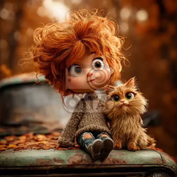 На нём изображена очаровательная героиня, уютно устроившаяся рядом с таким же рыжим, пушистым котом. Фоном служит роскошный золотистый лес, испещрённый мягкими лучами солнца и падающей листвой, создающей воздушную атмосферу блаженства и гармонии. Вся композиция пропитана теплом и умиротворенностью, заставляя вспомнить лучшие моменты золотой поры года. Контраст волос девушки и шерсти животного гармонично сочетается с оттенками осеннего леса, рождая ощущение единства с природой и внутреннего комфорта.