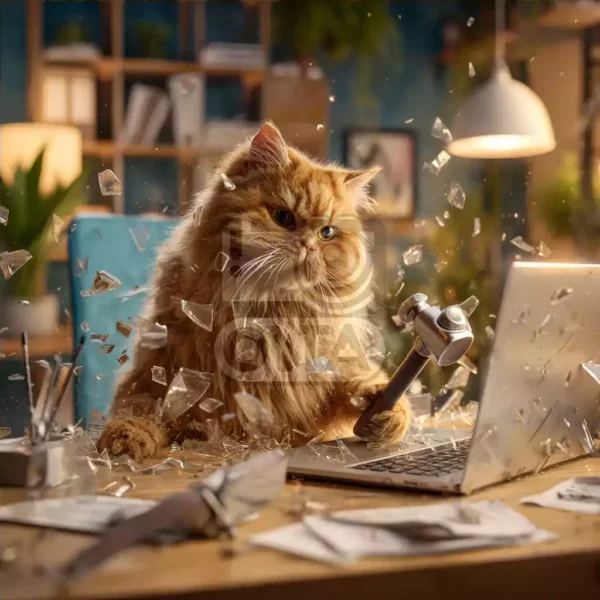 Картинка рыжий кот с ноутбуком, в его лапке молоток, которым он разбивает экран на пути к новым идеям, а осколки — разлетаются в разные стороны. Этот образ идеально подходит для материалов о креативности, инновациях и продуктивности в повседневной работе. Визуально сочетая домашний уют и дерзкое наступление на барьеры, он вызывает ощущение динамики и уверенности в себе. Ключевые преимущества такой картинки заключаются в ее способности привлекать внимание аудитории, которая ищет нестандартные решения, мотивацию и вдохновение для старта новых проектов.